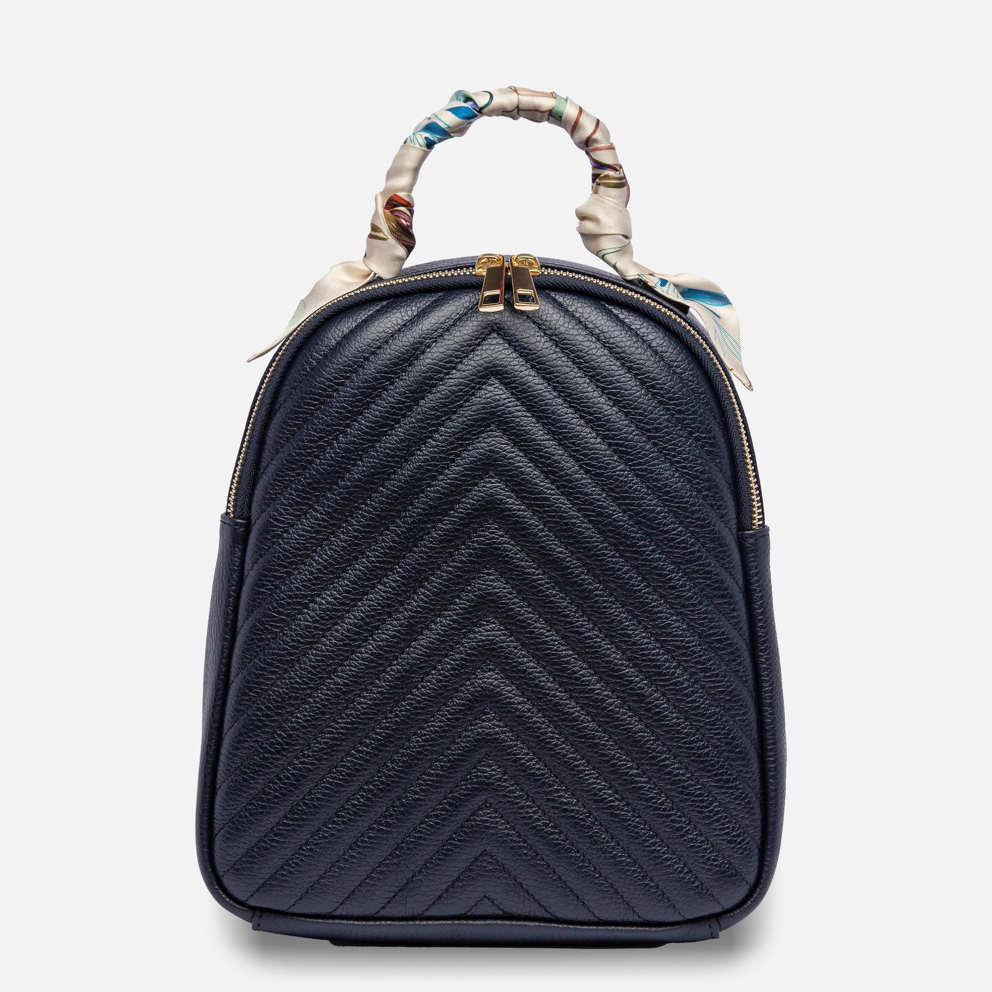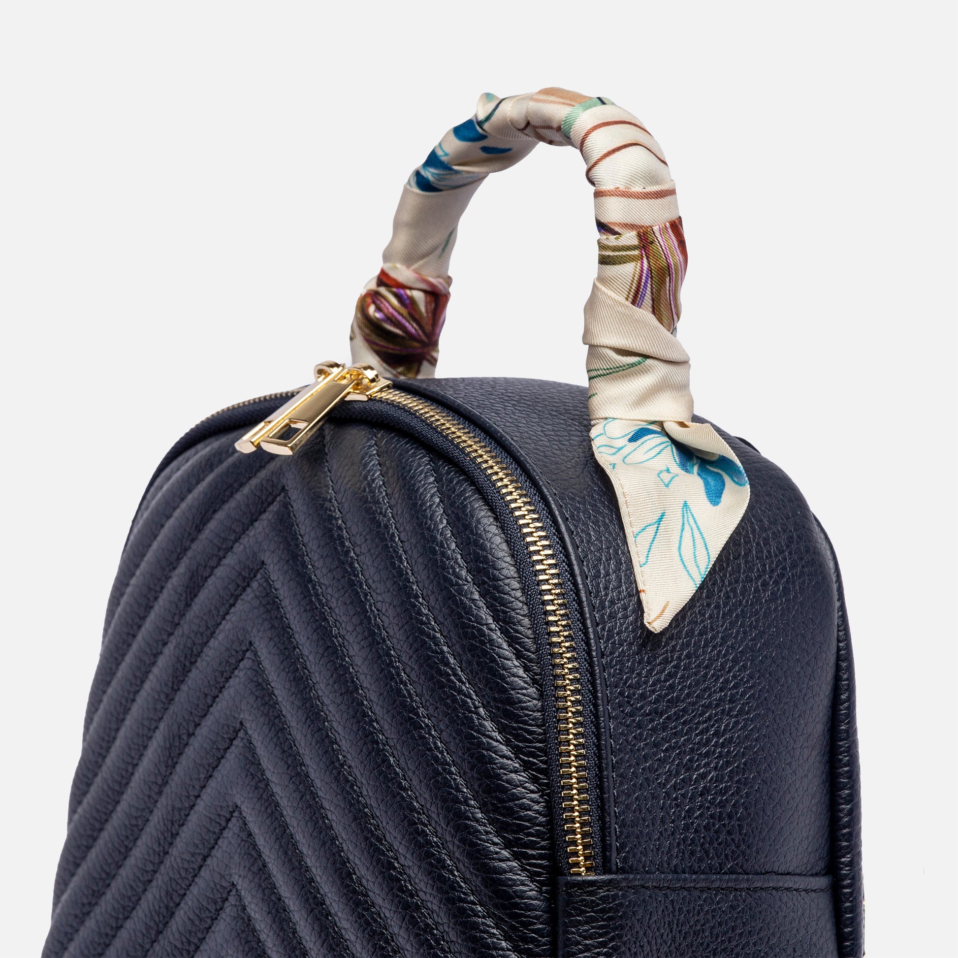 Zaino in vera pelle, impreziosito da un bandeau in pura seta cucito a mano, caratterizzato da una delicata stampa floreale e proposto in tiratura limitata. Il contrasto tra la texture decisa della pelle blu e la morbidezza cromatica del manico rivestito dona al modello Theia uno stile elegante e contemporaneo. La lavorazione trapuntata a motivo chevron aggiunge dinamismo alla sua struttura compatta. L’interno offre uno spazio unico per riporre l’essenziale, insieme a un nécessaire, un libro, la custodia degli occhiali e un iPad Air o dispositivi di dimensioni simili. Un alleato quotidiano, pensato per chi desidera funzionalità senza rinunciare alla cura dei dettagli.