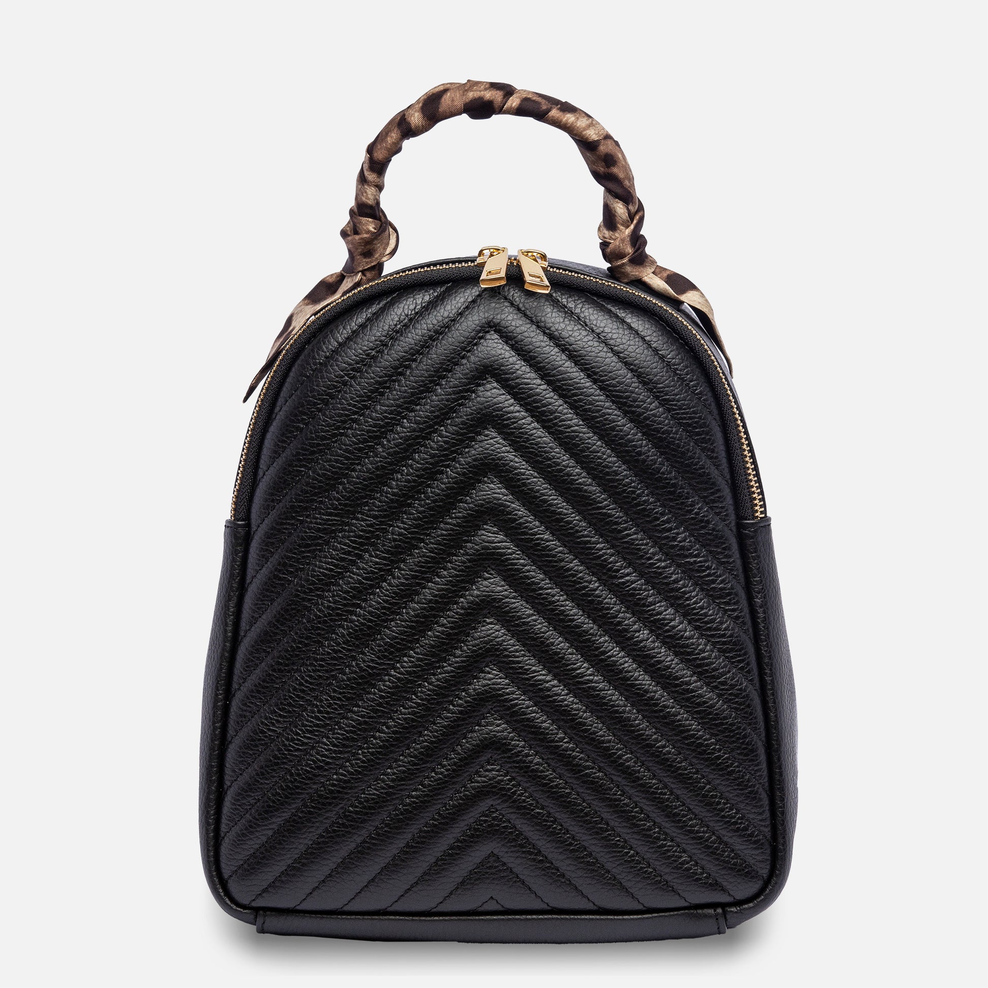 Zaino in vera pelle, impreziosito da un bandeau in pura seta cucito a mano con stampa animalier, proposto in tiratura limitata. Il contrasto deciso tra la texture della pelle nera e il manico rivestito conferisce al modello Theia uno stile audace e contemporaneo. La lavorazione trapuntata a motivo chevron aggiunge dinamismo alla struttura compatta. L’interno offre uno spazio unico per riporre l’essenziale, insieme a un nécessaire, un libro, la custodia degli occhiali e un iPad Air o dispositivi di dimensioni simili. Un alleato quotidiano, pensato per chi desidera funzionalità senza rinunciare alla cura dei dettagli.